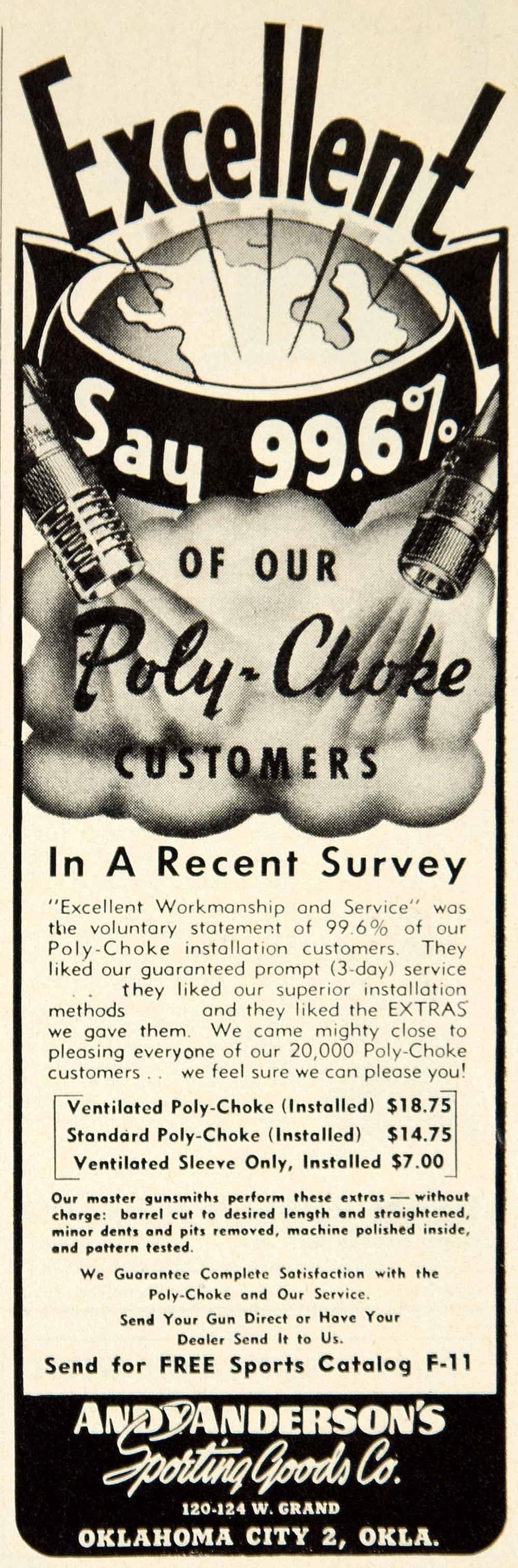 This is an original 1949 black and white print ad for Poly-Choke installations on guns that were performed by gunsmiths at Andy Anderson's Sporting Goods Company of Oklahoma City, OK.