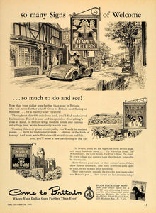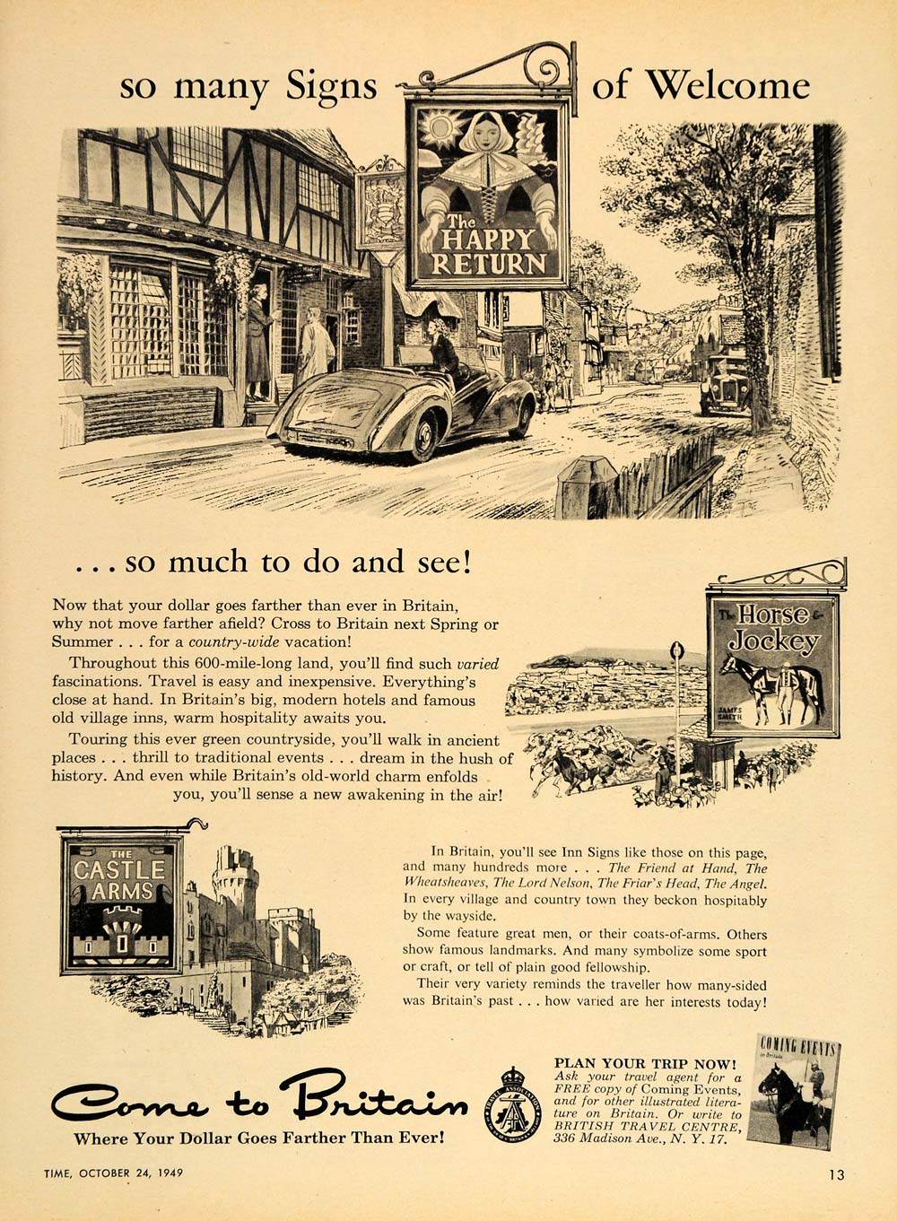 This is an original 1949 black and white print ad promoting travel to Britain from the British Travel Centre.