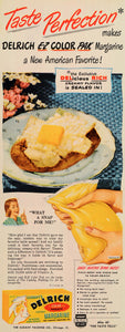 This is an original 1949 color print ad for promoting the Delrich and E-Z Color Pak Margarine from Cudahy Packing Company, Chicago, Illinois.