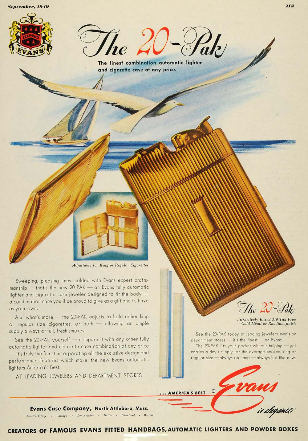 This is an original 1949 color print ad for the Evans 20-Pak, a combination of cigarettes and the automatic lighter. Evans Case Company is located in North Attleboro, Massachusetts.