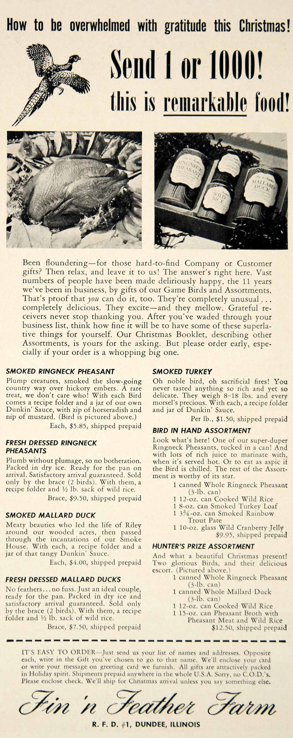 This is an original 1949 black and white print ad for the delicious bird meat from the Fin 'n Feather Farm.