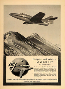 This is an original 1949 black and white print ad for the Grumman Panther, the U. S. Navy's carrier-based Fighter, from the Grumman Aircraft Engineering Corporation, Bethpage, Long Island, New York.