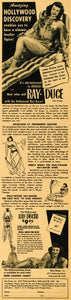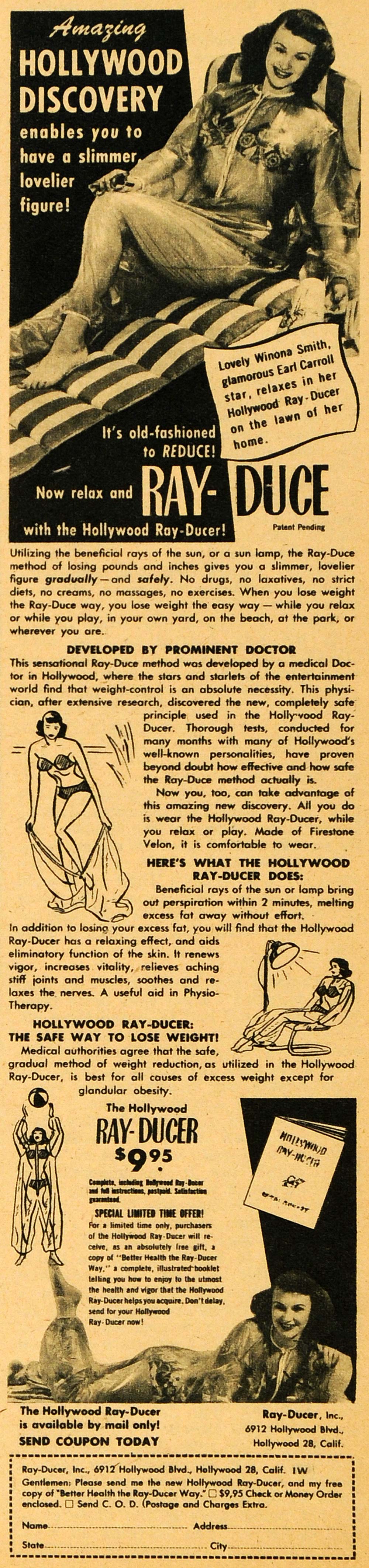This is an original 1949 black and white print ad for Ray-Ducer, Inc. located at 6912 Hollywood Blvd., Hollywood, California. Pictured in the ad is Winona Smith, an Earl Carroll star.
