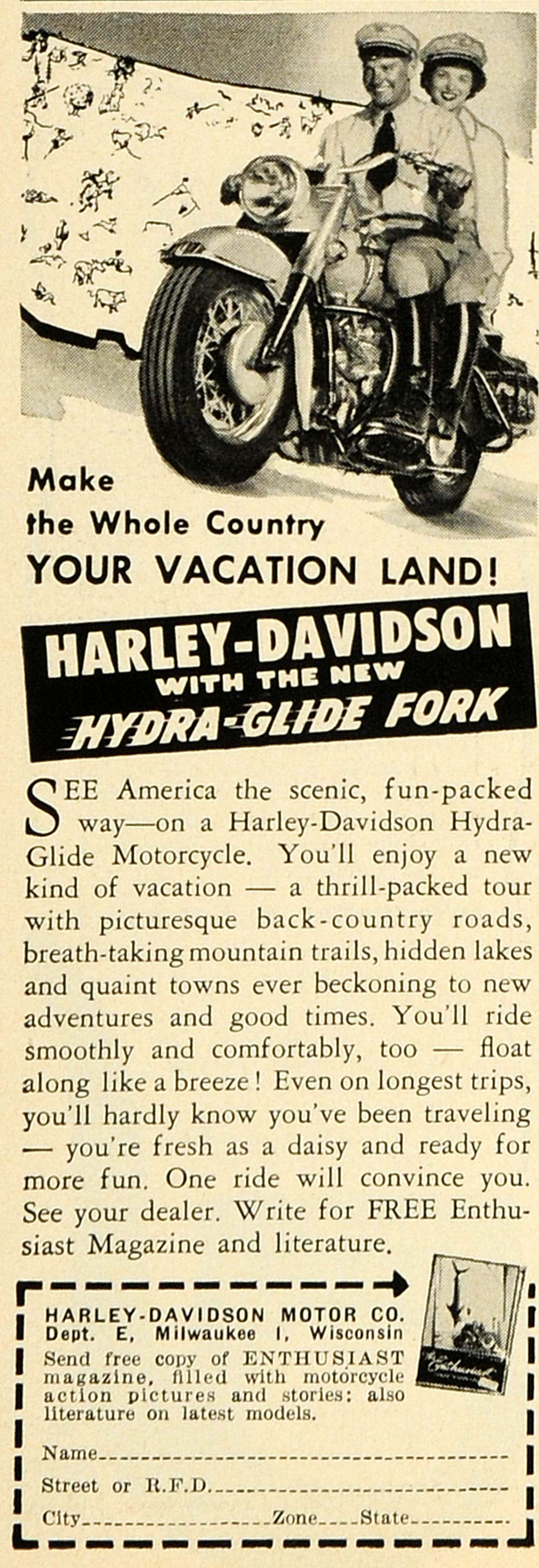 This is a small original 1949 black and white print ad for the Hydra-Glide Fork Harley-Davidson motorcycle by the Harley-Davidson Motor Company of Milwaukee, Wisconsin.