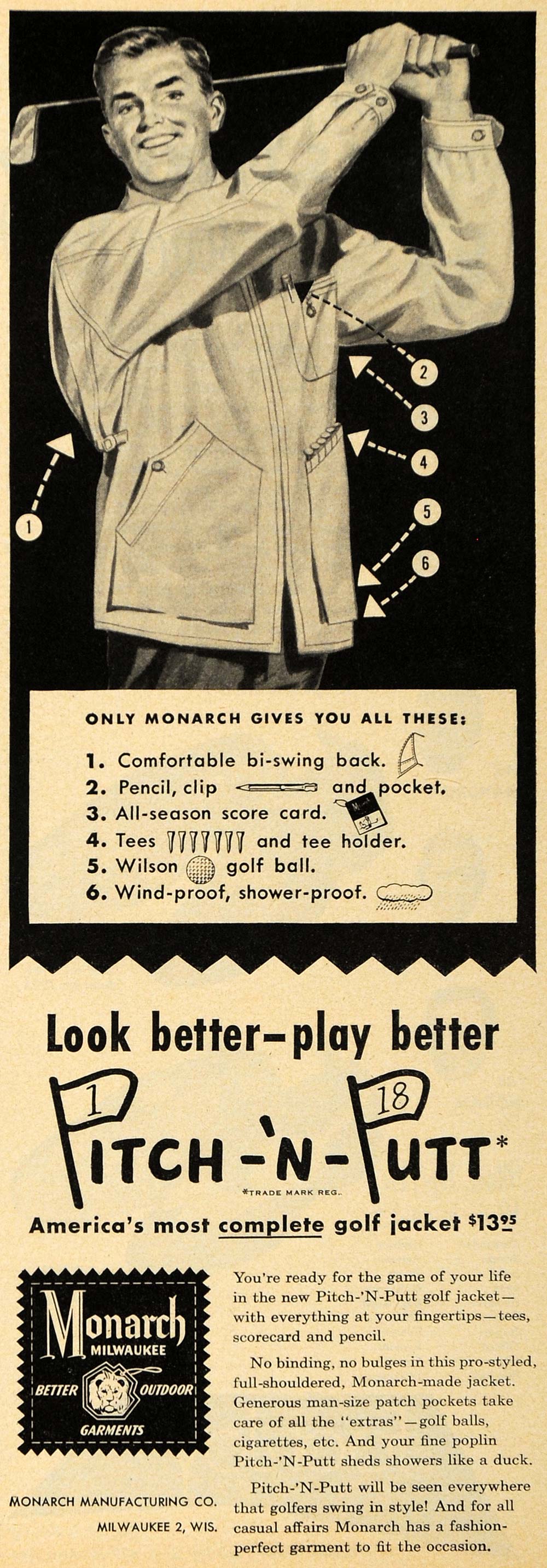 This is an original 1949 black and white print ad for the Pitch-'N-Putt Golf Jacket from Monarch Manufacturing Company located in Milwaukee, Wisconsin.