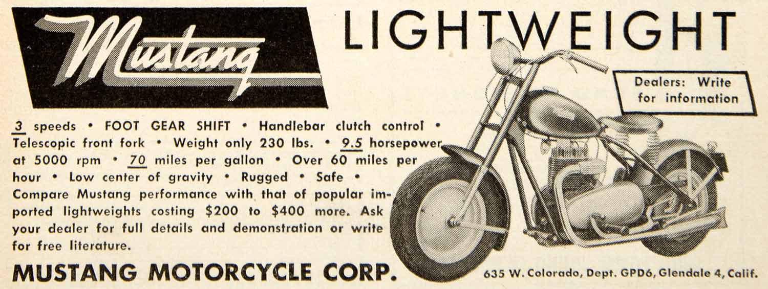 This is an original 1949 black and white print ad for the Mustang Motorcycle Corporation of 635 W. Colorado of Glendale, California.