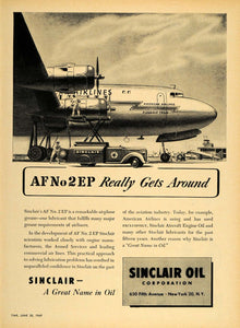 This is an original 1949 black and white print ad for Sinclair's AF No. 2 EP airplane lubricating grease from the Sinclair Oil Corporation, 630 Fifth Avenue, New York City.