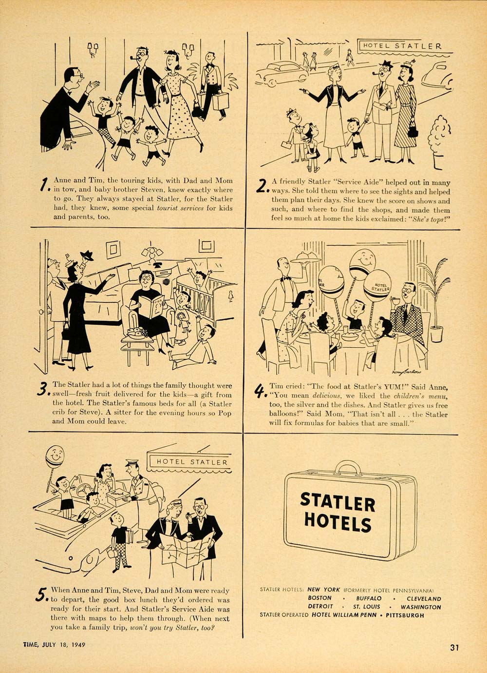 This is an original 1949 black and white print ad for the Statler Hotels.
