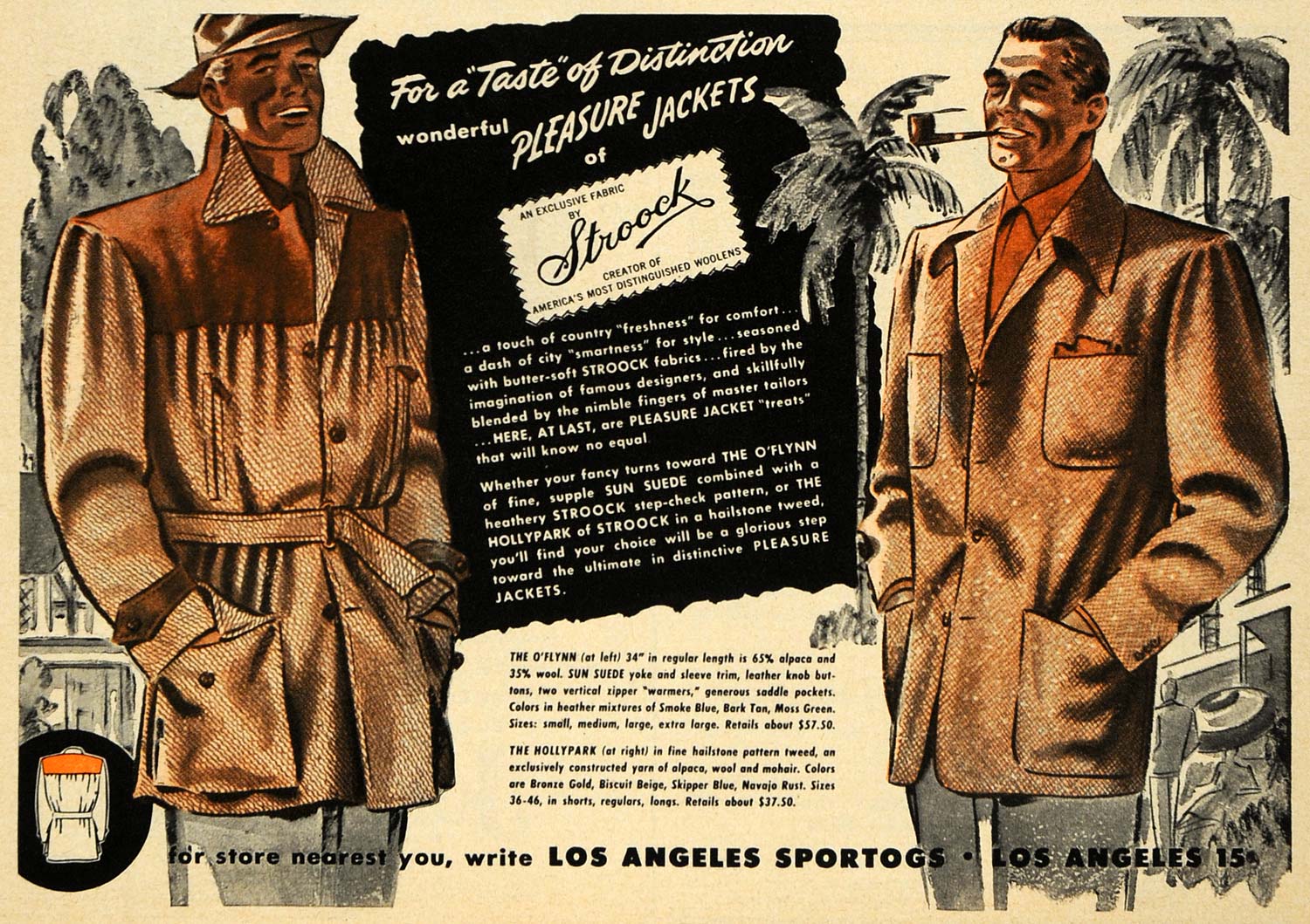 This is an original 1949 color print ad for the Stroock Pleasure Jackets promoting the O'Flynn jacket and the Hollypark jacket.