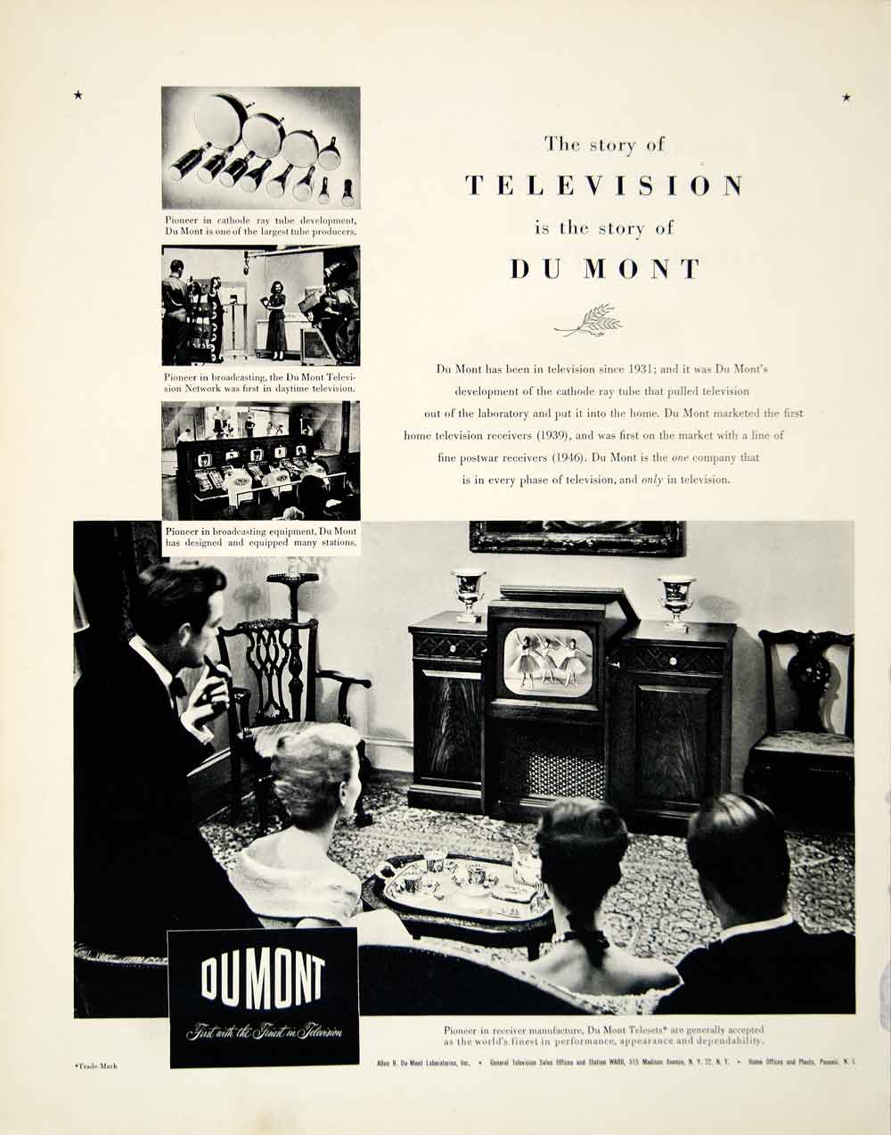 This is an original 1949 black and white print ad for Du Mont Telesets and broadcasting.