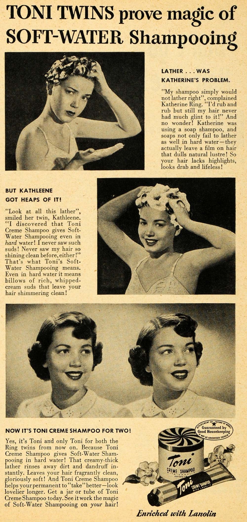 This is an original 1949 black and white print ad for Toni Creme Shampoo. Pictured in the ad are the Ring Twins (Katherine and Kathleene)