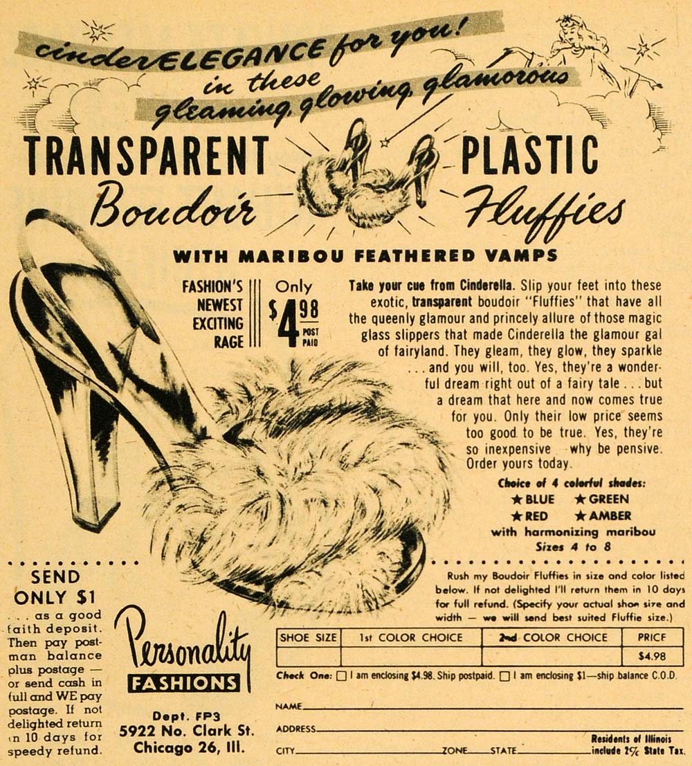 This is an original 1949 black and white print ad for Cinderella Transparent Plastic Boudoir Fluffies manufactured by Personality Fashions located at 5922 N. Clark St. in Chicago, Illinois.