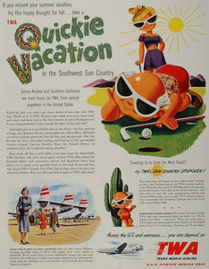 This is an original 1949 color print ad for Trans World Airlines promoting the "quickie vacation" to the Sun Country of the American Southwest, via a TWA Lockheed Constellation Skyliner airplane.