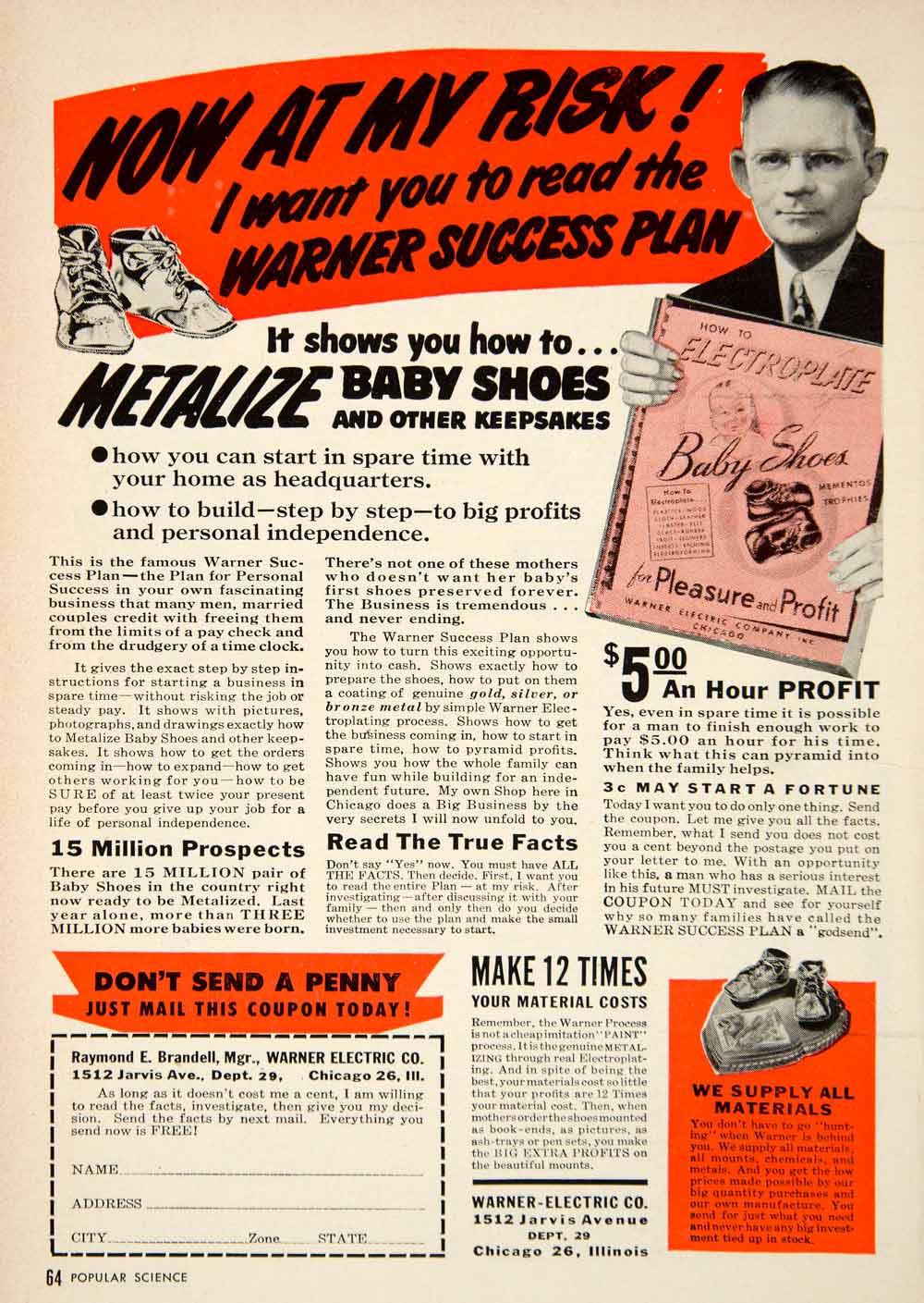 This is an original 1949 color print ad for the Warner Electric Company of 1512 Jarvis Avenue, Chicago, Illinois. The advertisement discusses how to "metalize" baby shoes and other keepsakes so they can be cherished forever.