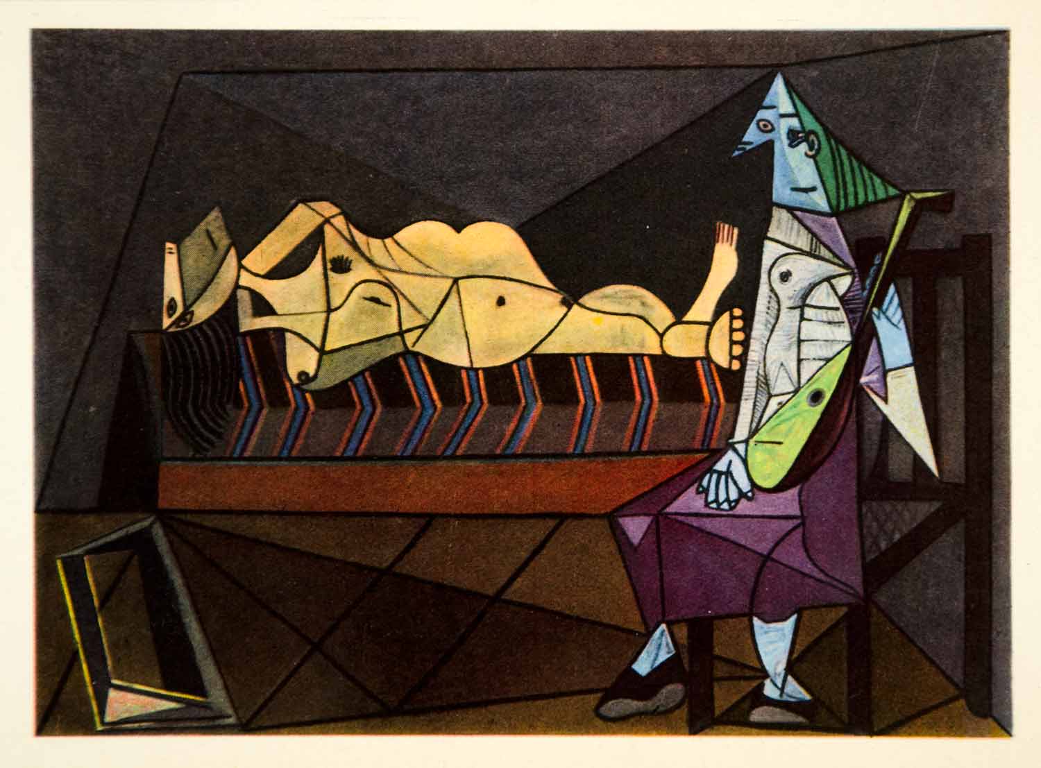 1949 Color Print Couche Femme Assise Mandoline Cubism Portrait Nude PCZ1