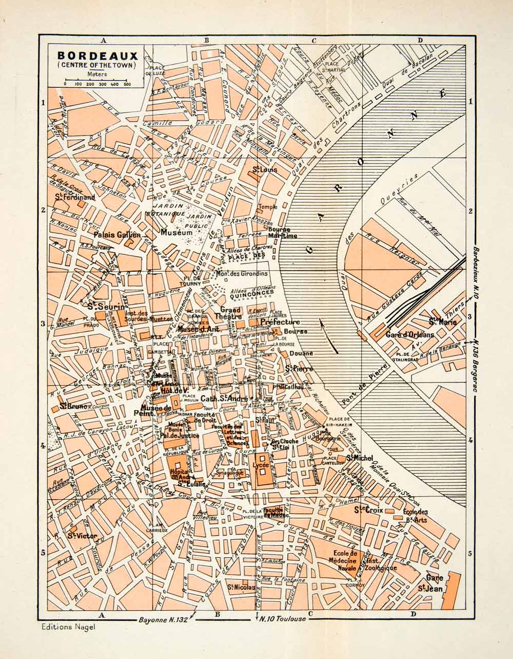 This is an original 1949 two-color lithographed map of Bordeaux, France.