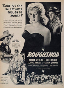 This is a 1949 black and white print ad for the movie "Roughshod" starring Robert Sterling, John Ireland, Claude Jarman, Jr. and Gloria Grahame. Produced by Richard H. Berger and directed by Mark Robson. RKO Radio Pictures.