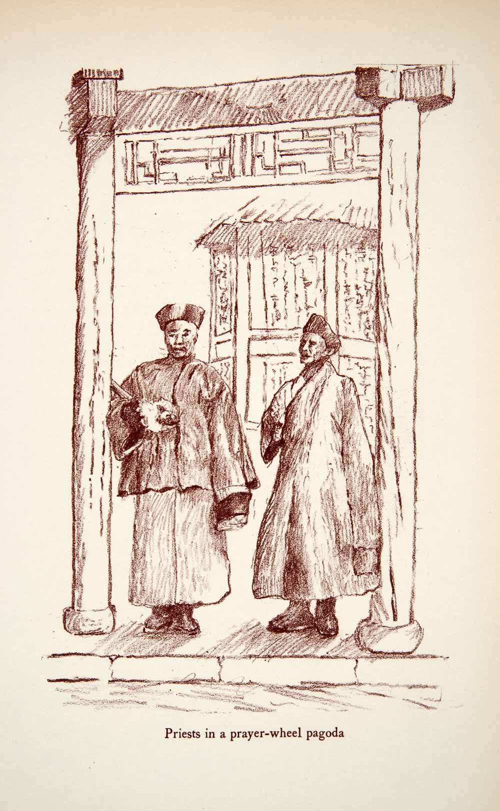 This is an original 1949 monochrome photolithograph of priests in the doorway of a Pagoda in China.