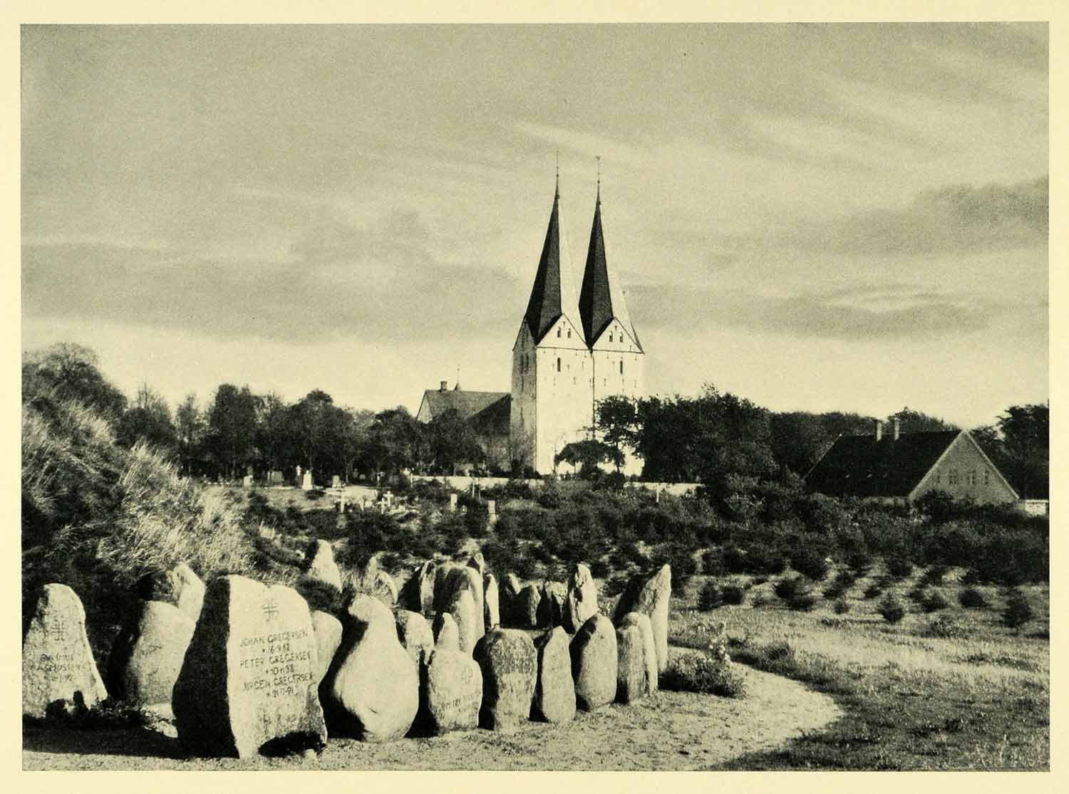 This is an original 1949 halftone print of the ancient church of Broager in Denmark, which was made famous during the 1864 War. This two spire church is the only one in the village, and the oldest parts of the church date back to 1200, though it has later been built upon. Its architecture primarily consists of Roman and late Gothic styles.