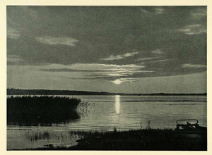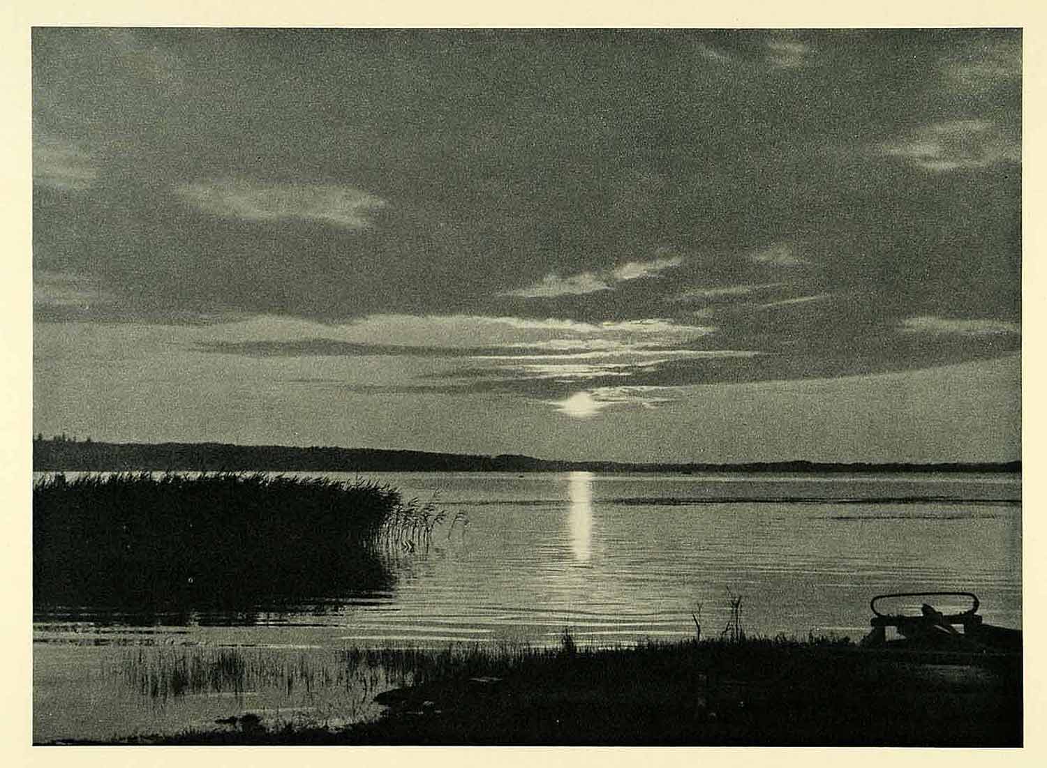 This is an original 1949 halftone print of a serene and quiet sunset over Lake Fure in Denmark.
