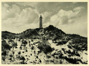 This is an original 1949 halftone print of the Norre Lyngvig Lighthouse in the Homsland dunes of Denmark.