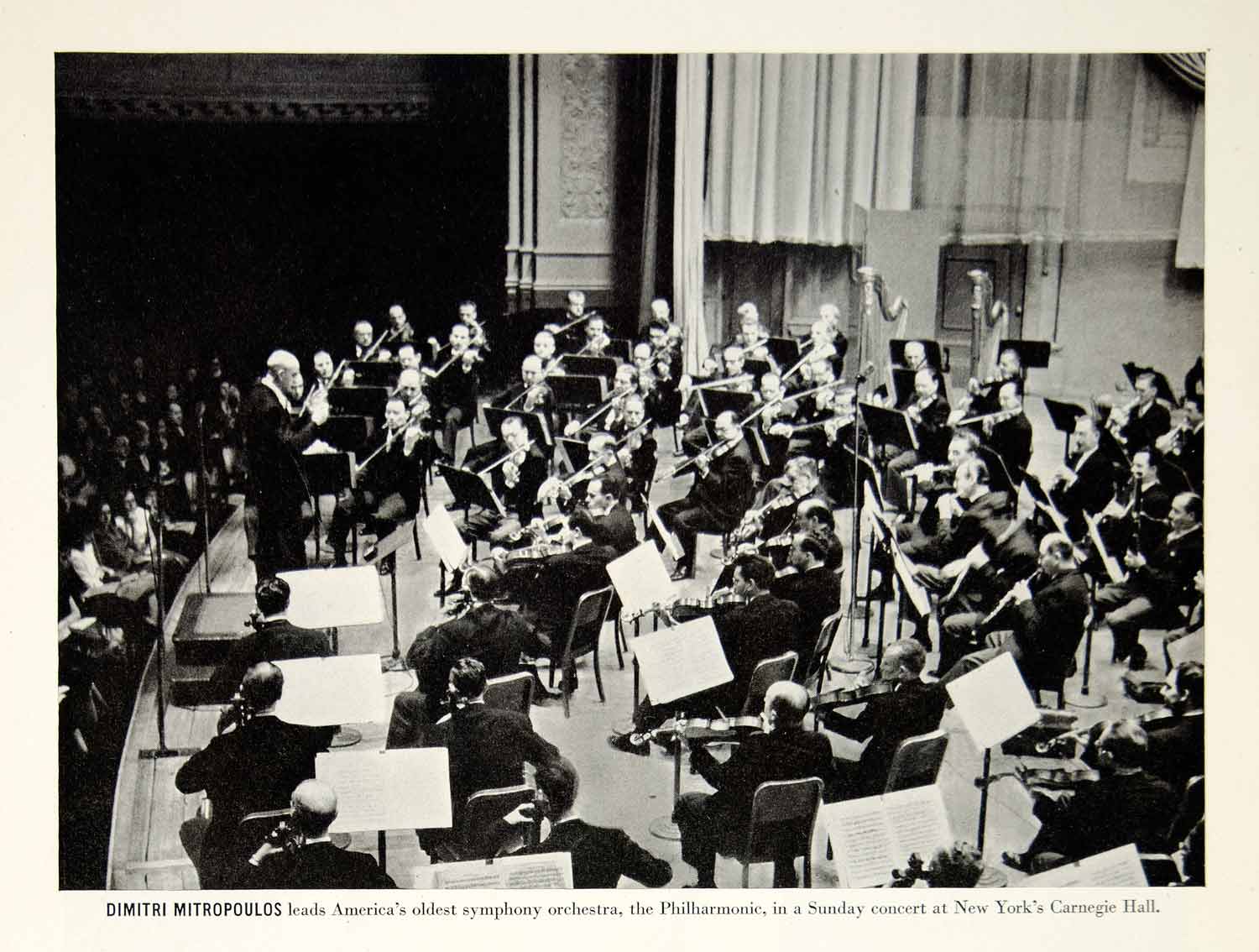 This is an original 1949 black and white halftone print of the Philharmonic Orchestra performing under the conductor Dimitri Mitropoulos at Carnegie Hall in New York City.