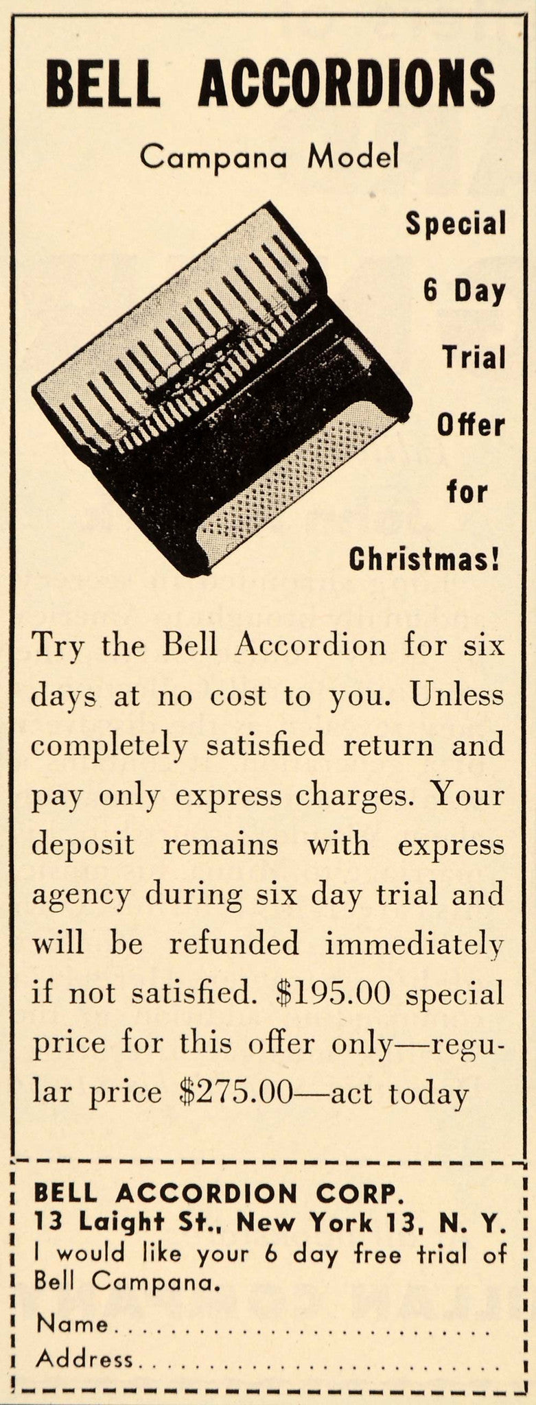 This is an original 1950 black and white print ad for Bell Accordions manufactured by the Bell Accordion Corp. at 13 Laight St., New York 13, N. Y. The ad promotes the Campana Model at a special price of $195.00, regularly priced at $275.00.