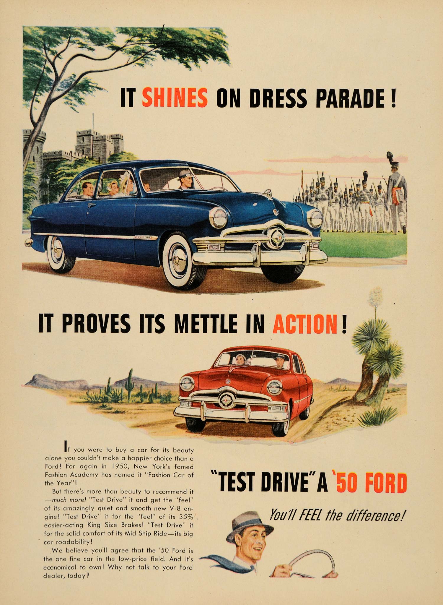 This is an original 1950 color print ad for the '50 Ford automobile line.