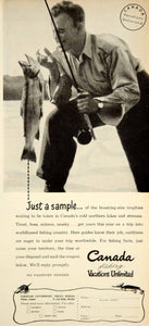 This is an original 1950 black and white print ad for fishing vacations unlimited packages that were offered by the Canadian Government Travel Bureau of Ottawa, Canada.
