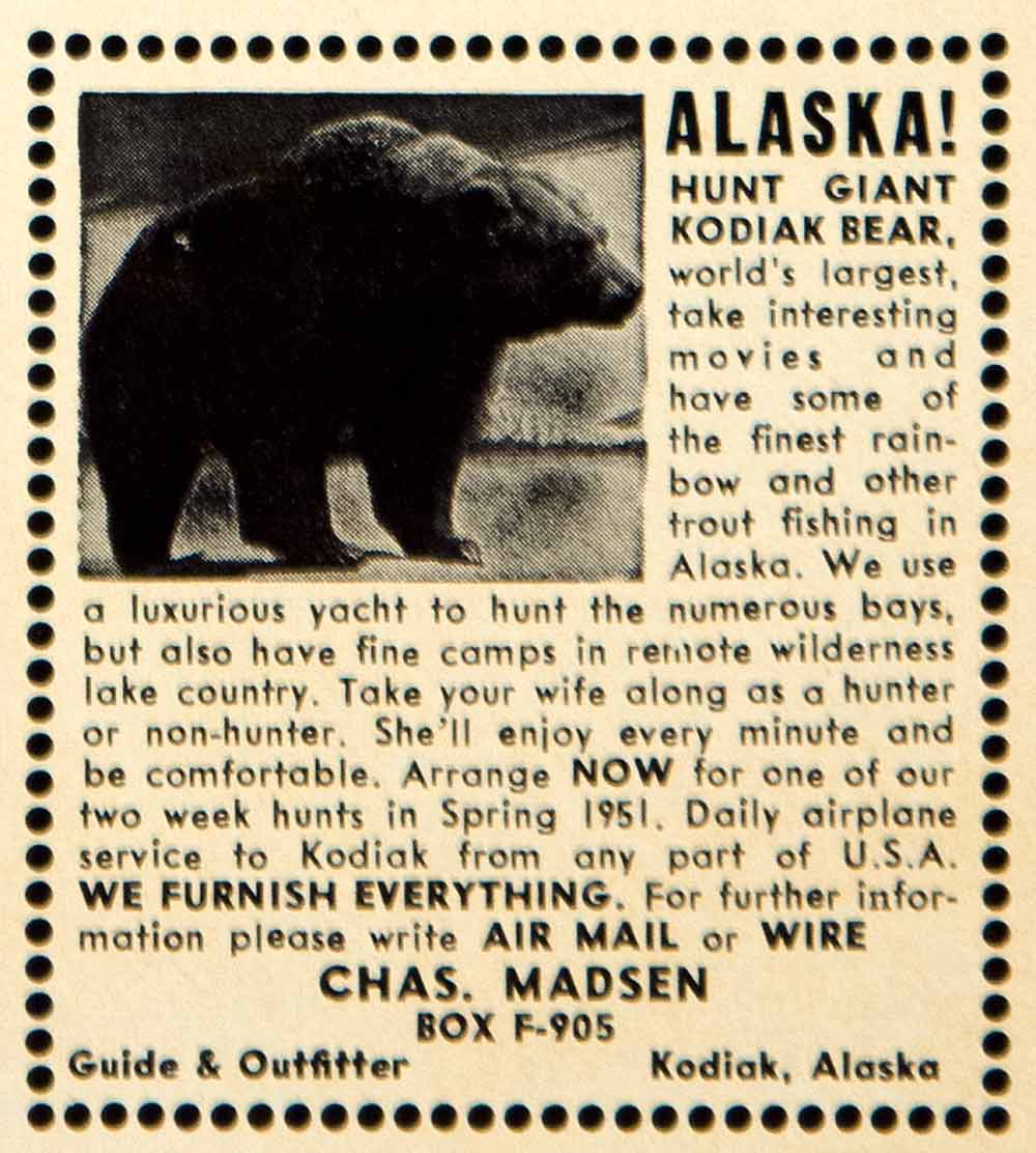 This is an original 1950 black and white print ad for grizzly bear hunting excursions that were offered by guide and outfitter Charles Madsen of Kodiak, Alaska (AK).