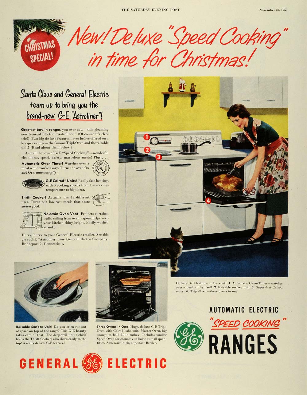 This is an original 1950 color print ad for Automatic Electric "Speed Cooking" Ranges by General Electric.