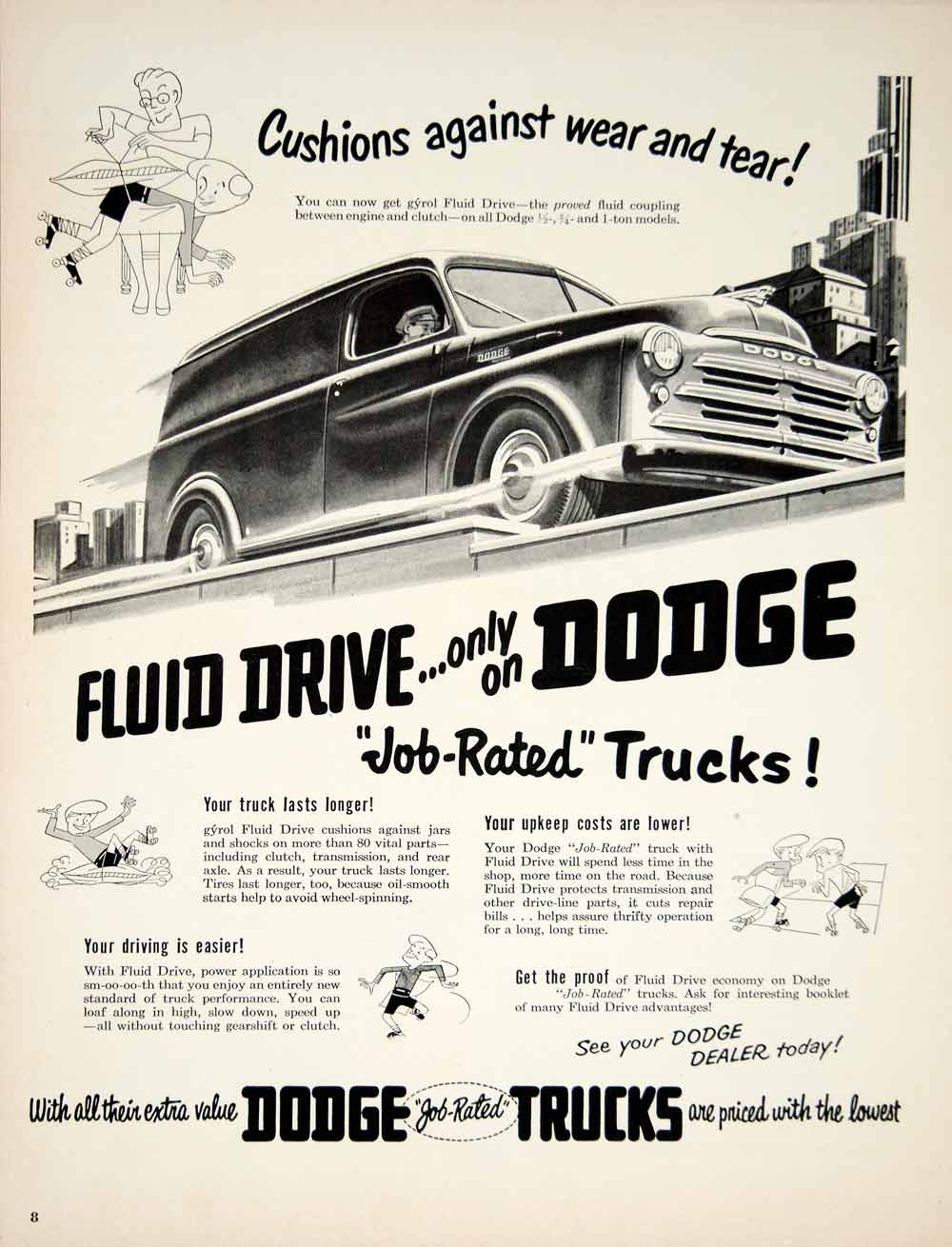 This is an original 1950 black and white print ad for the 1950 line of Dodge trucks that came equipped with "Fluid Drive" cushions on over 80 their auto parts.