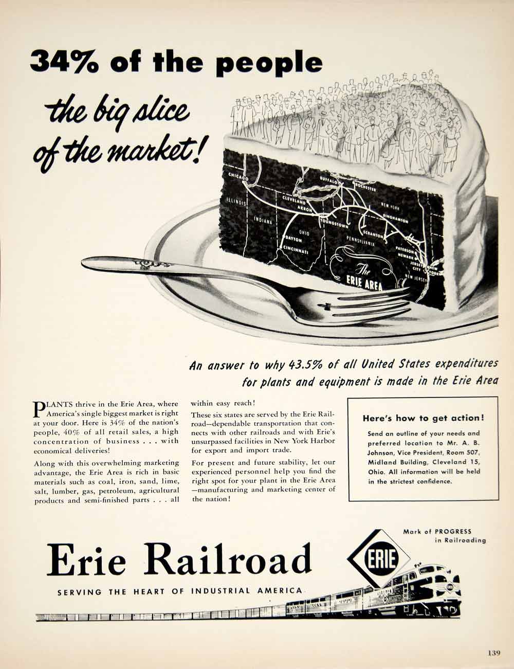 This is an original 1950 black and white print ad for industrial and shipping services offered by the Erie Railroad.