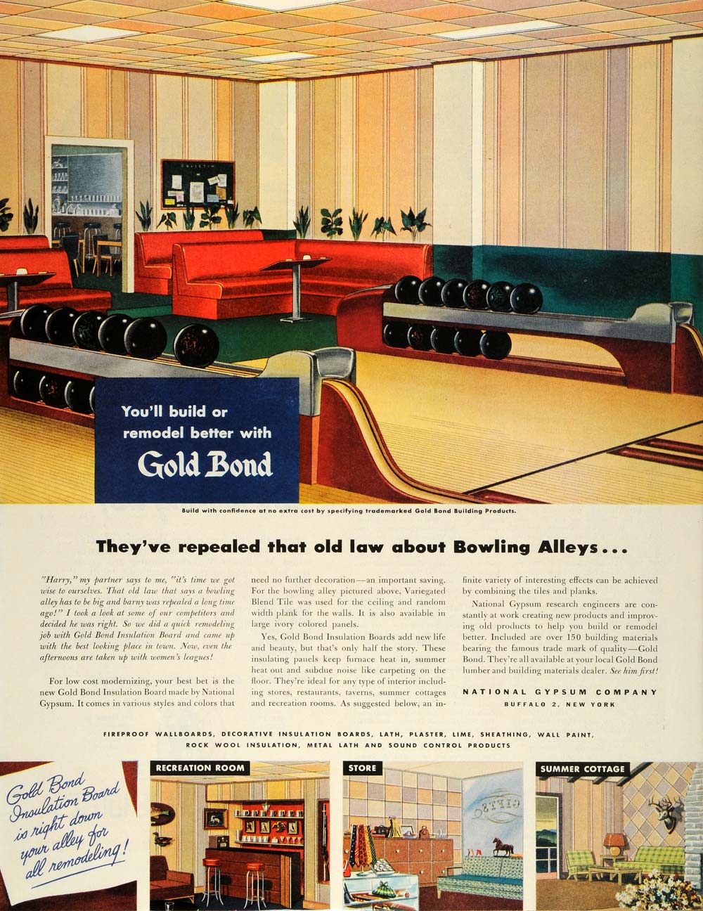This is an original 1950 color print ad for fireproof wallboards, decorative insulation boards, lath, plaster, lime, sheathing, wall paint, rock wool insulation, metal lath, sound control products and other Gold Bong building products by the National Gypsum Company of Buffalo, New York.