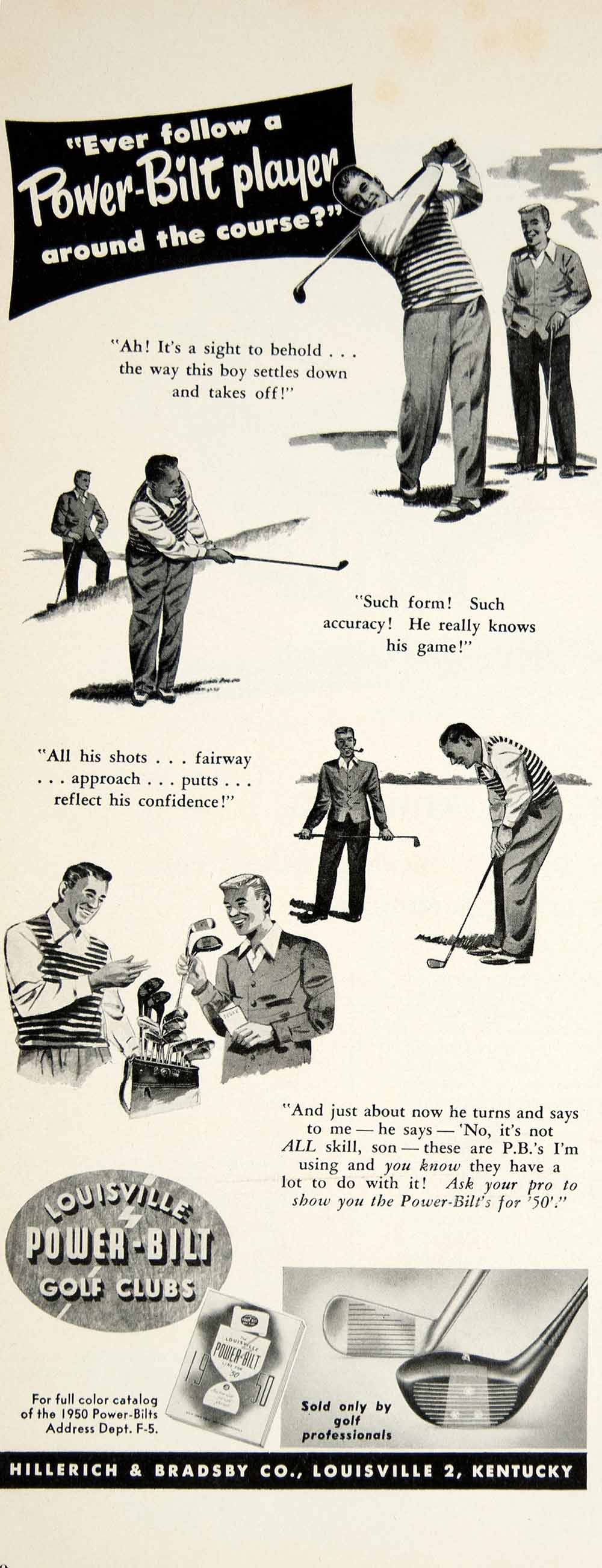 This is an original 1950 black and white print ad for the 1950 Louisville Power-Bilt golf club sets that were made and sold by the Hillerich & Bradsby Company of Louisville, Kentucky (KY).