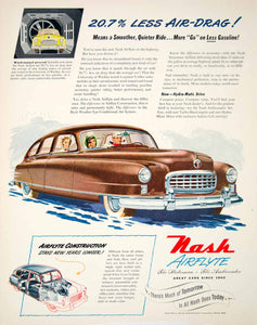 This is an original 1950 color print ad for the Nash Statesman and Ambassador sedans that were designed with Airflyte drag reducing design.