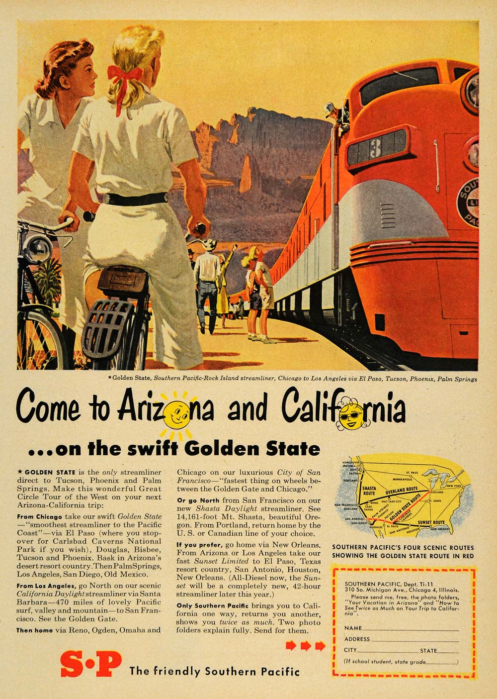 This is an original 1950 color print ad for the Southern Pacific-Rock Island Streamliner, featuring travel to Arizona and California.