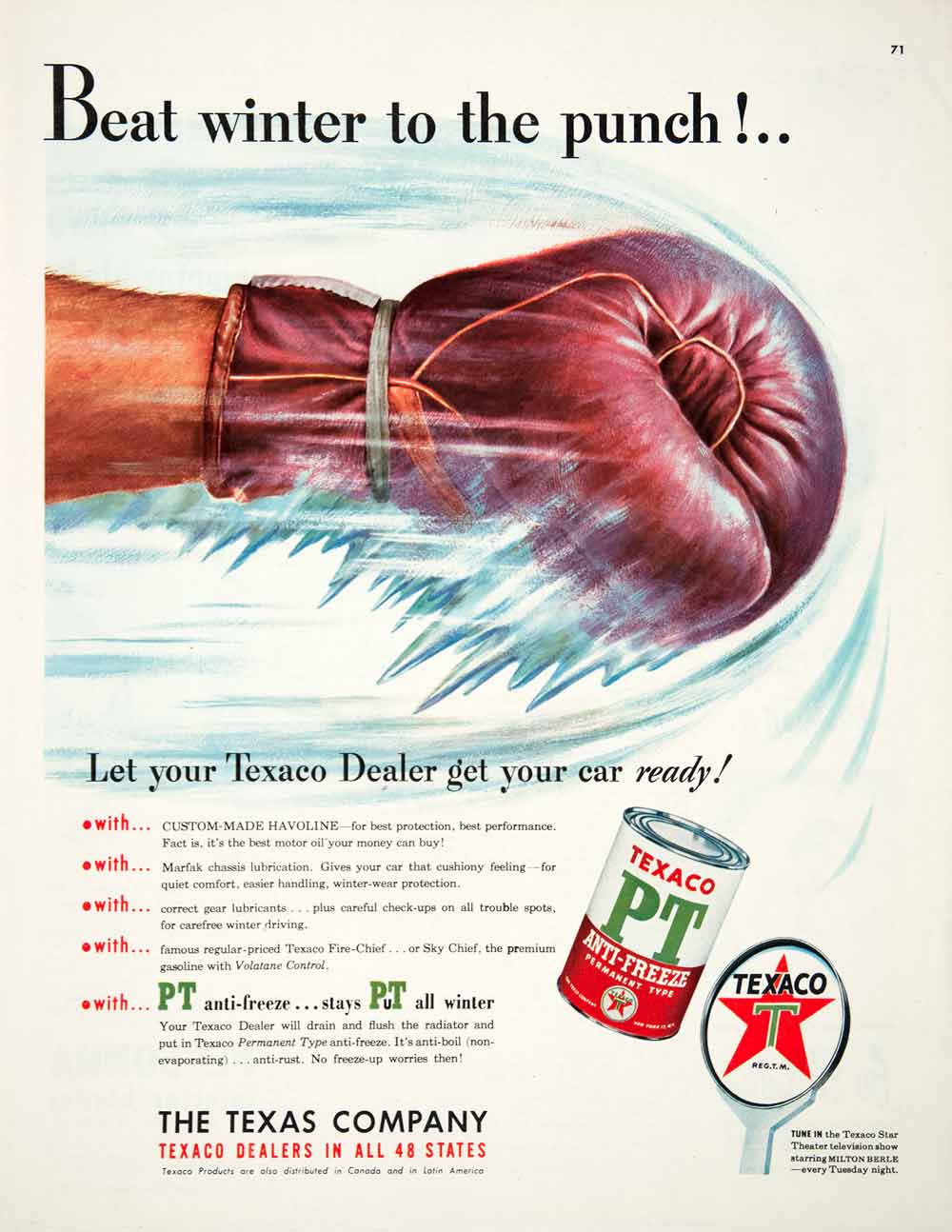 This is an original 1950 color print ad for Texaco Permanent Type Anti-Freeze found at Texaco Dealers all over the United States and Canada.