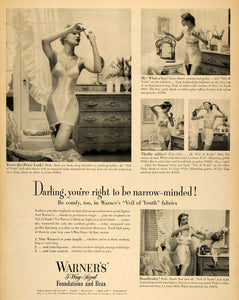 This is an original 1950 black and white print ad for Warner's 3-Way-Sized Foundations and Bras