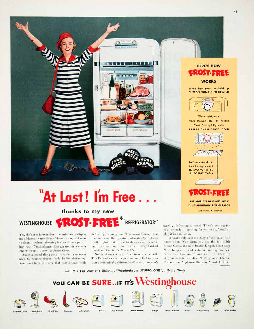 This is an original 1950 color print ad for the Westinghouse Frost-Free Refrigerator. It features a housewife who, thanks to the revolutionary process shown to the right, is free from ball and chain of "Food Removal, Messy Water and Frost Scraping."