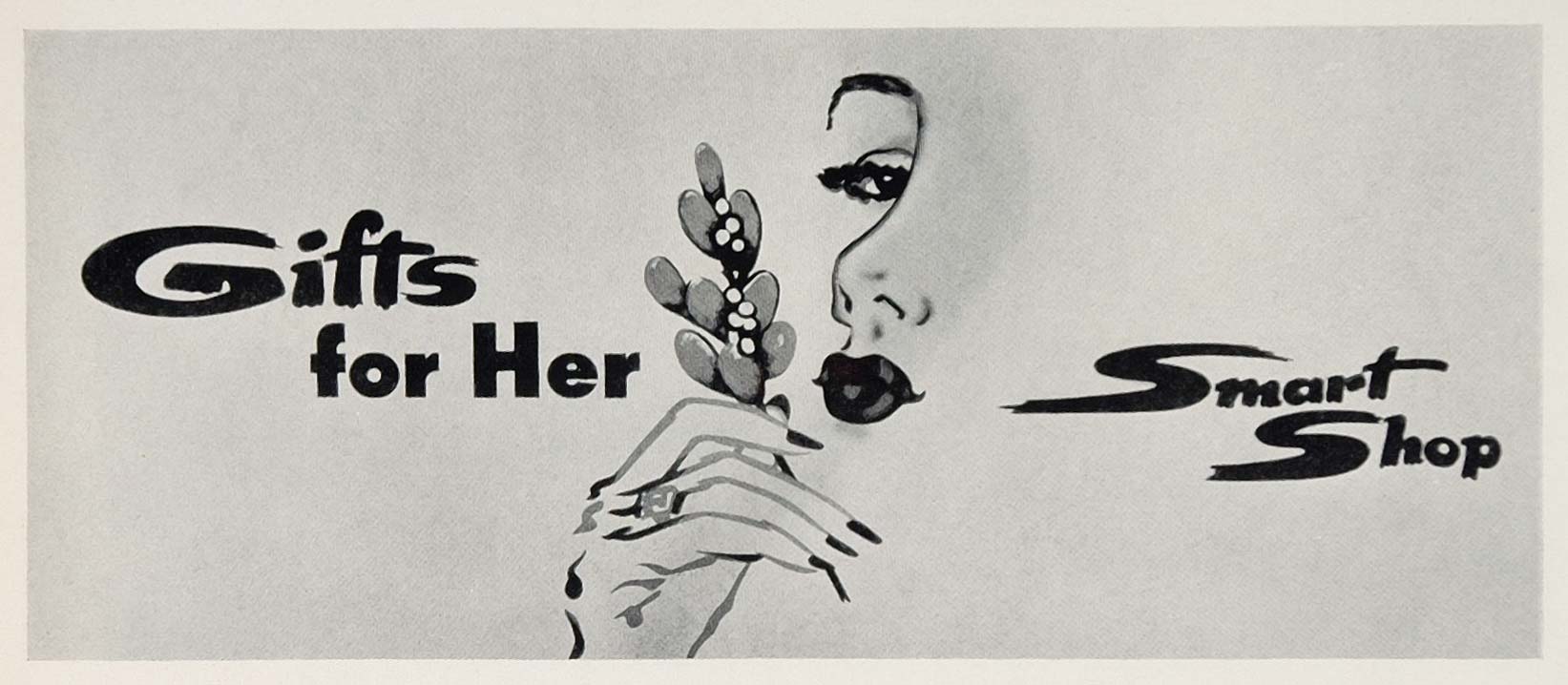 This is an original 1950 halftone print of an elegant outdoor advertising billboard poster for gifts from the Smart Shop...for Her. Artist: B. F. Mitchem ; Art Director: B. F. Mitchem.