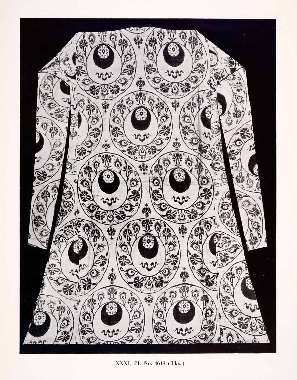 This is an original 1950 black and white halftone print of a kaftan that belonged to Turkish Sultan Murad III (1574-1595). A kaftan is like a mantle that is usually worn over indoor clothing. It is made entirely of silk and the design consists of carnations, leaves, stars, crescents, and clouds.