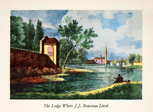 This is an original 1950 color photolithograph of the lodge where Genevan philosopher, composer and writer, Jean-Jacques Rousseau lived.