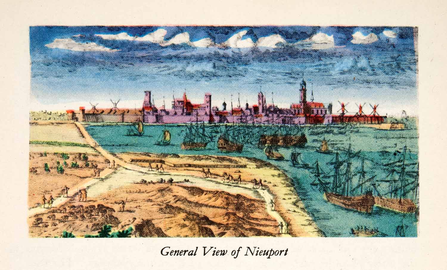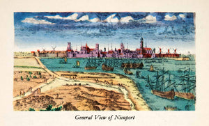 This is an original 1950 color photolithograph of a view of Nieuwpoort, Flanders, Belgium.