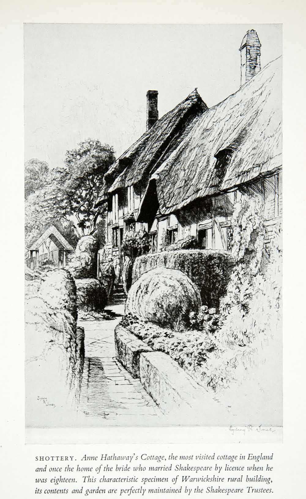This is an original 1950 black and white halftone print of Anne Hathaway's Cottage in Shottery, Warwickshire, England. This was where Shakespeare's wife lived before they were married.