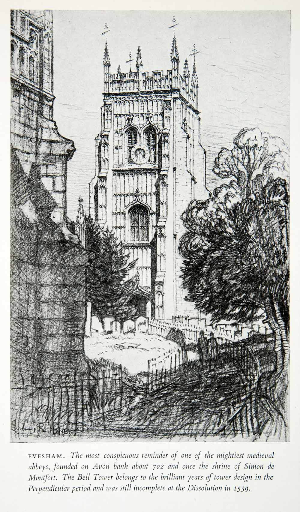 This is an original 1950 black and white halftone print of Evesham, Worcestershire, England. The town was founded around the abbey which only has Abbot Lichfield's Bell Tower remaining.