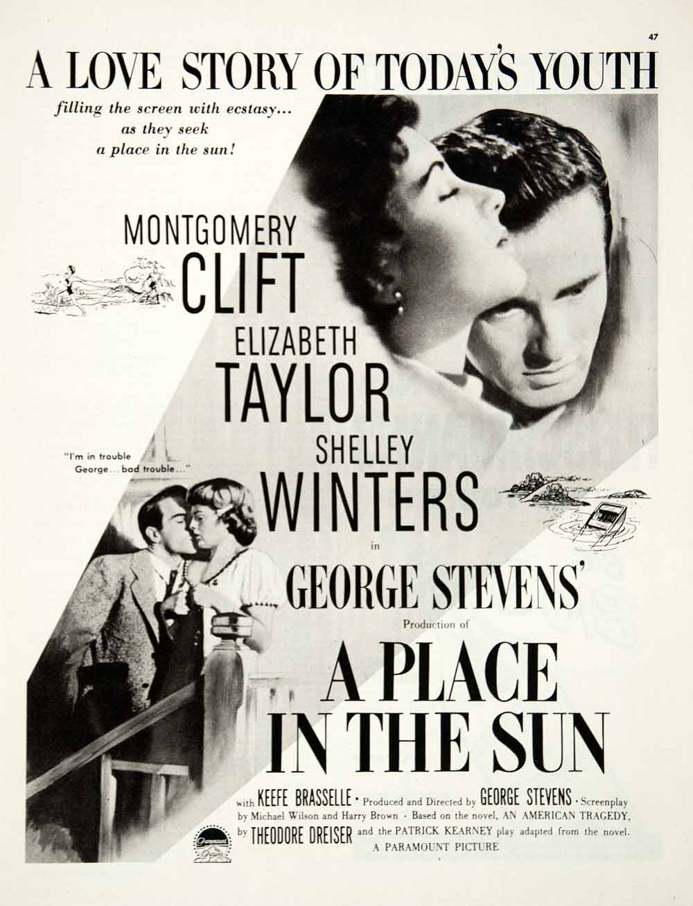 This is an original 1951 black and white print ad for the movie "A Place in the Sun," originally written by Theodore Dreiser. It starred Montgomery Clift, Elizabeth Taylor, Shelley Winters and Keefe Brasselle. It was produced and directed by George Stevens, written by Michael Wilson and Harry Brown and adapted from the novel by Patrick Kearney.