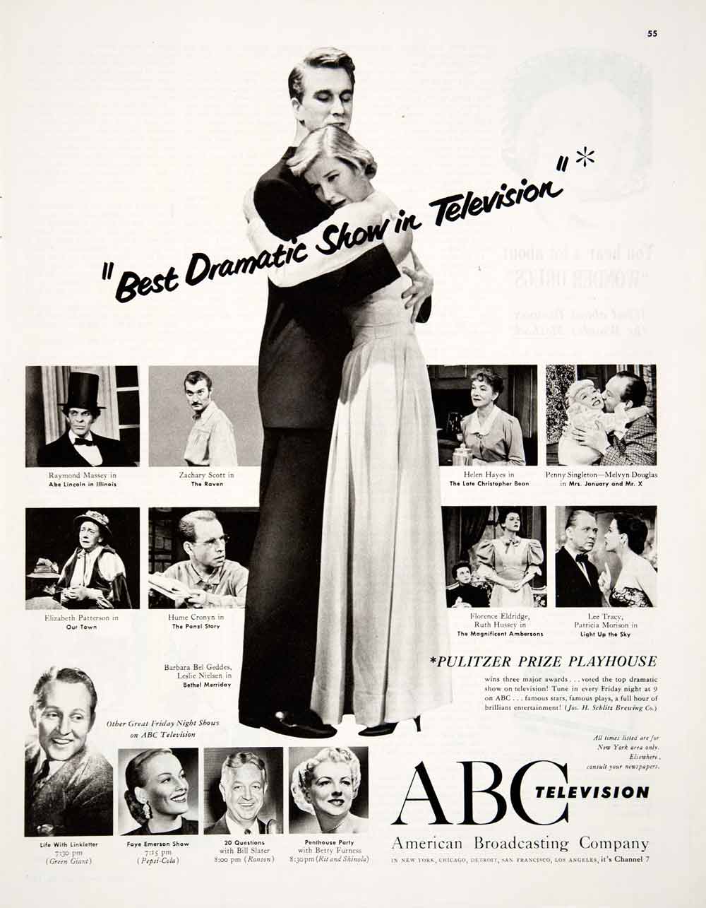 Keywords specific to this image: Vintage Advertising, American Broadcasting Company, Abe Lincoln in Illionois, The Raven, Helen Hays, The Late Christopher Bean, Penny Singleton, Melvyn Douglas, Mrs. January and Mr. X, Elizabeth Patterson, Hume Cronyn, Ponzi Storyt, Life with Linkletter, Green Giant, Pepsi Cola, Ronson, 20 Questions, Bill Slater, Penthouse Pary, Betty Furness, Rit and Shinola, Schlitz Brewing