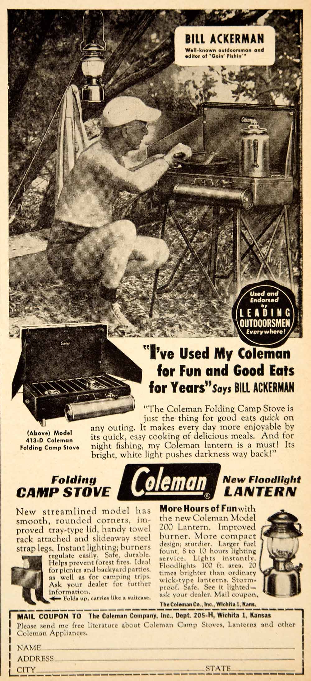 1951 Ad Coleman Camp Stove Floodlight Lantern Bill Ackerman Outdoorsman YHF1