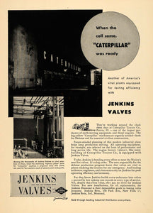 This is an original 1951 black and white print ad for Jenkins Valves from the Jenkins Brothers of New York. The ad features an image of the interior of the Caterpillar tractor company.